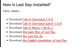 S.T.A.L.K.E.R.: Last Day is a S.T.A.L.K.E.R. mod pack based on Call of Misery and version 1.4.22 of Call of Chernobyl, originally created by the Eastern S.T.A.L.K.E.R. community. It includes several addons previously unknown to the majority of the western S.T.A.L.K.E.R. community, such as MLR, which adds a lot of new characters and tasks, Outfit Marauder, adding lootable outfits on fallen stalkers, or an extended edition of Outfit Addon, adding not only outfits and helmets already present in the regular version of Outfit Addon, but also several variants of all types of apparel: regular, worn, and damaged.
